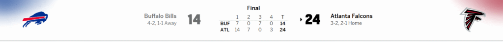 The final score of the matchup was Falcons 24, Bills 14. From the opening kickoff, Atlanta established momentum with strong rushing and efficient passing. The Bills struggled to keep up, with turnovers and defensive pressure affecting their scoring drives.