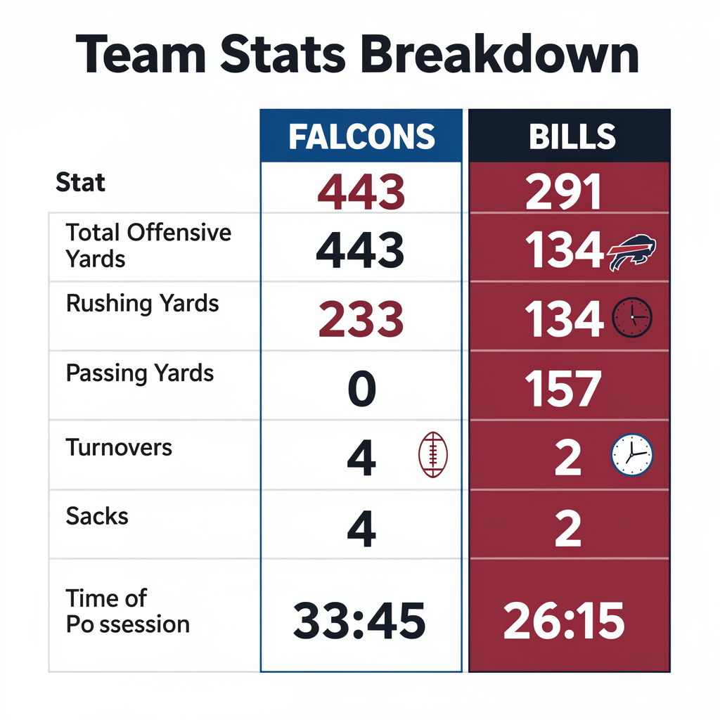Analysis: Atlanta’s superiority in total yards, rushing efficiency, and ball security helped them control both the clock and the scoreboard. These numbers explain the Falcons’ ability to sustain drives and limit Buffalo’s scoring chances.